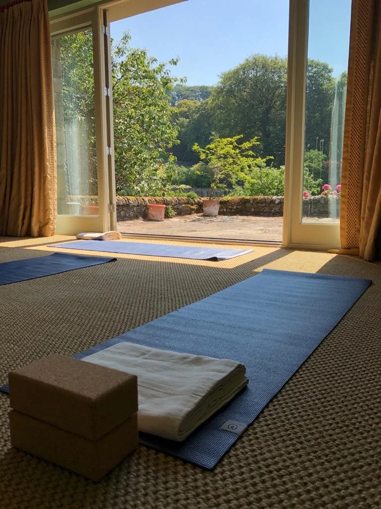 Just across the yard from the house, the yoga shala comfortably fits 11 mats. It has huge French doors, with views across the patio to the woodland garden, and up to the impressive Blua Crag.